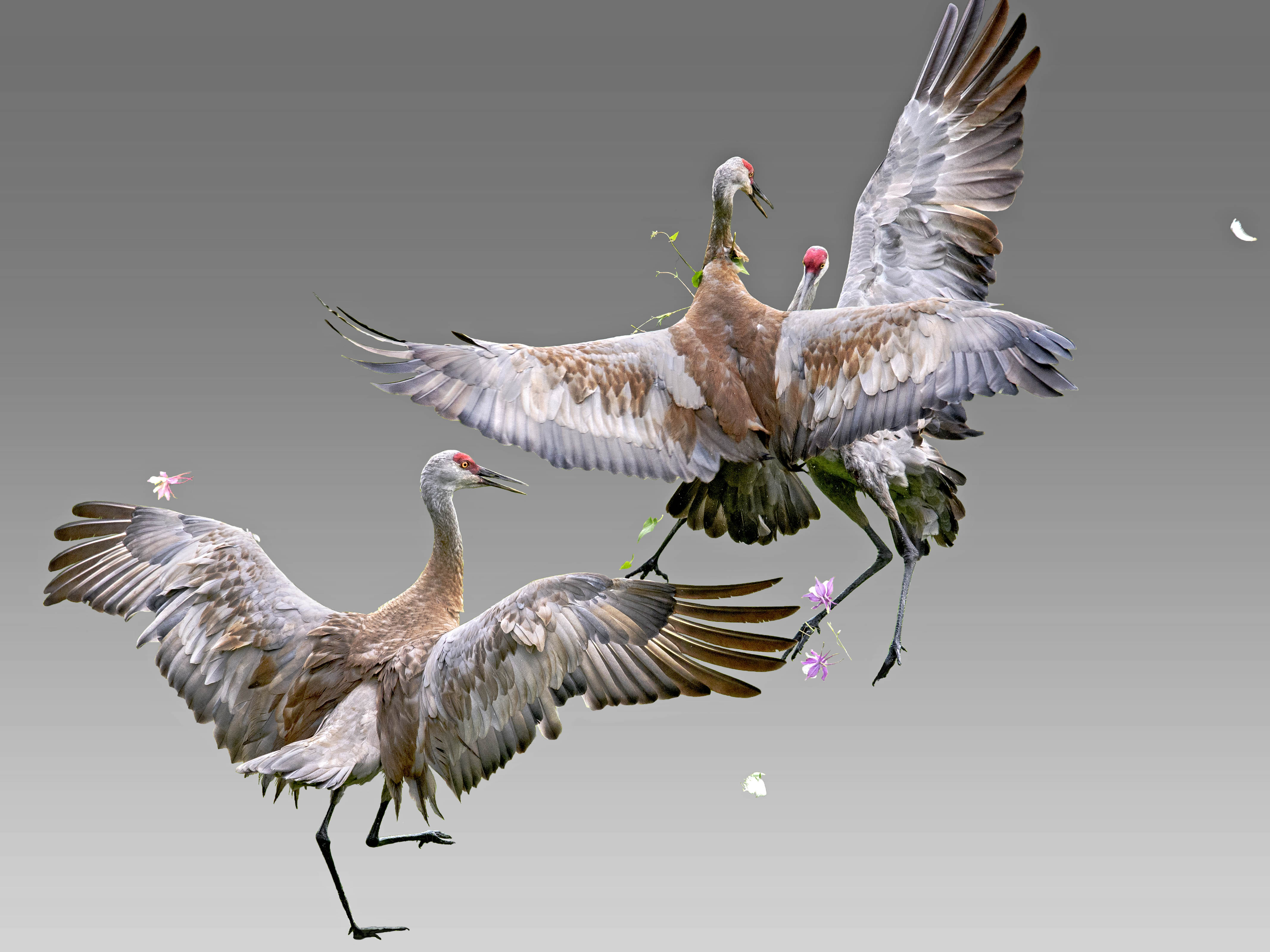 Spectacular leaps, jumps, body slams, and bill stabs are effective against predators and against other cranes competing for personal space, nest territories, or mates.