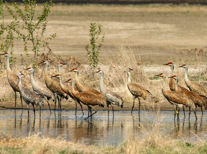 The cranes inspect their familiar territory, celebrating with unison calls and dance. Next, they cross the valley to check out the neighborhood. In the afternoon, they return to forage, to snooze, and to mate.