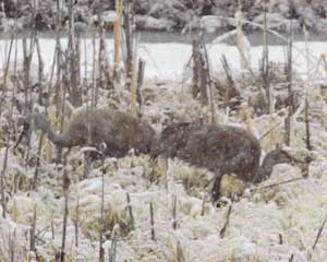 In 2001, a pair of cranes (perhaps Millie and Roy) made a nest in early May. They were chased off by a fox on June 10 and abandoned the nest (perhaps plundered by the fox). The cranes remained at the pond for most of the summer. They were dive-bombed mercilessly by several pairs of nesting mew gulls and wandering Bonaparte's gulls.