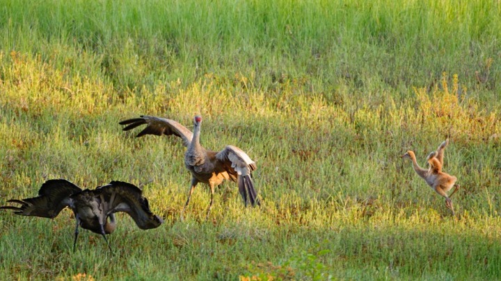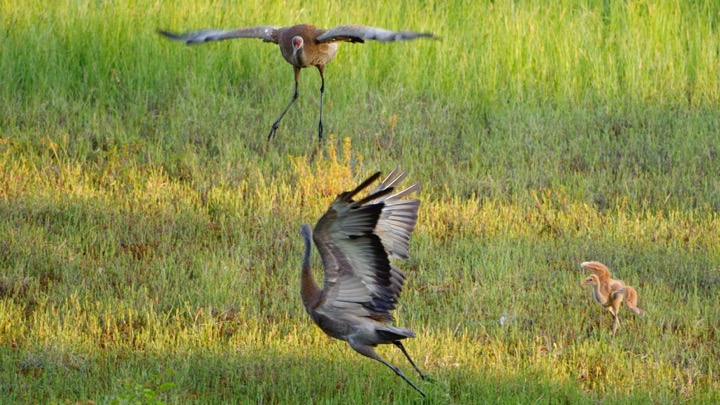 Hastings was precocious. On July 5th, he presented a Droop-wing Threat display toward a squirrel. Also on that day, he began to dance with his parents. In his initial dance attempts, he fell down (see "One month old Sandhill" video) and remained a little timid for the next week but resumed dancing and flight school practice with vigor.